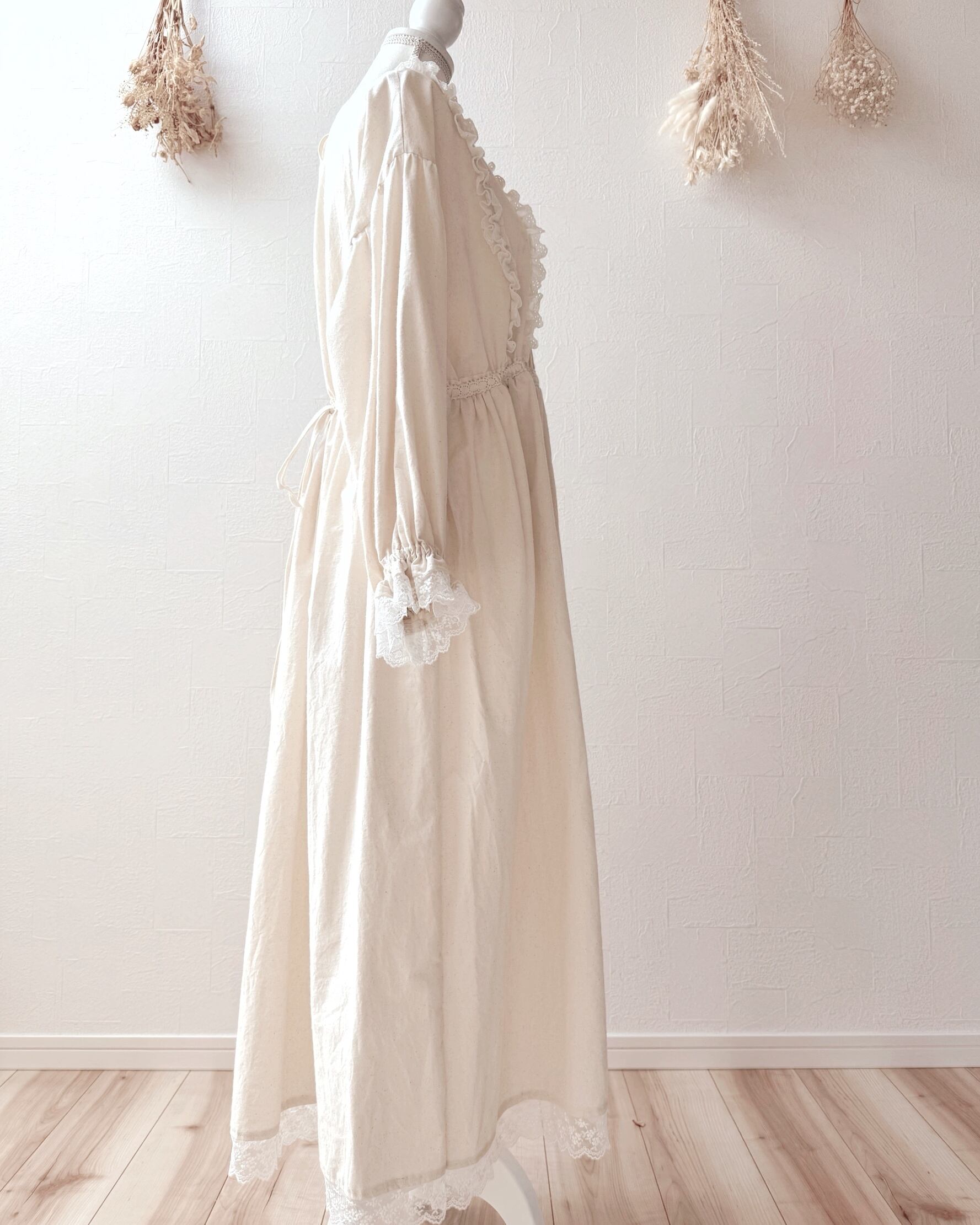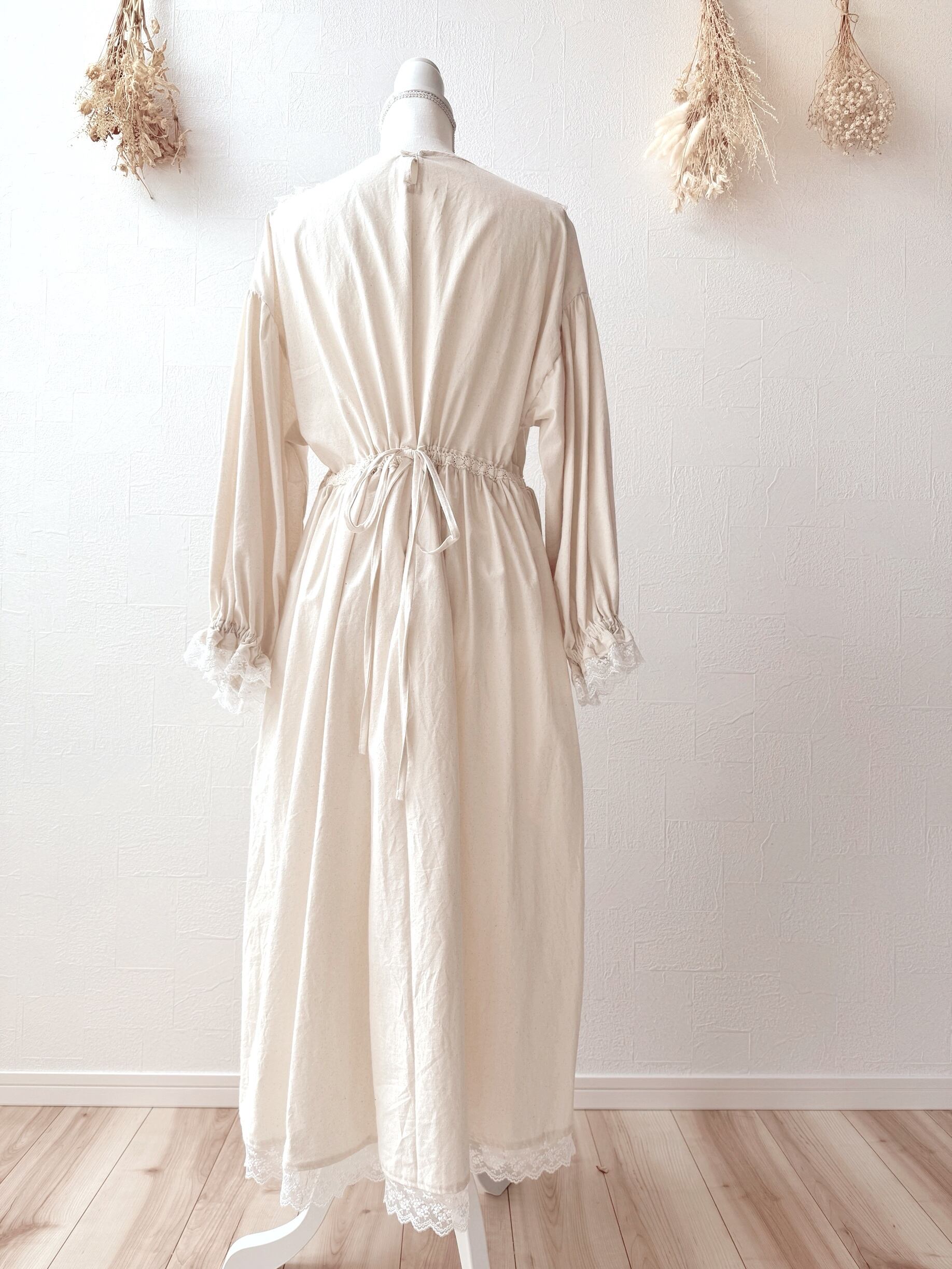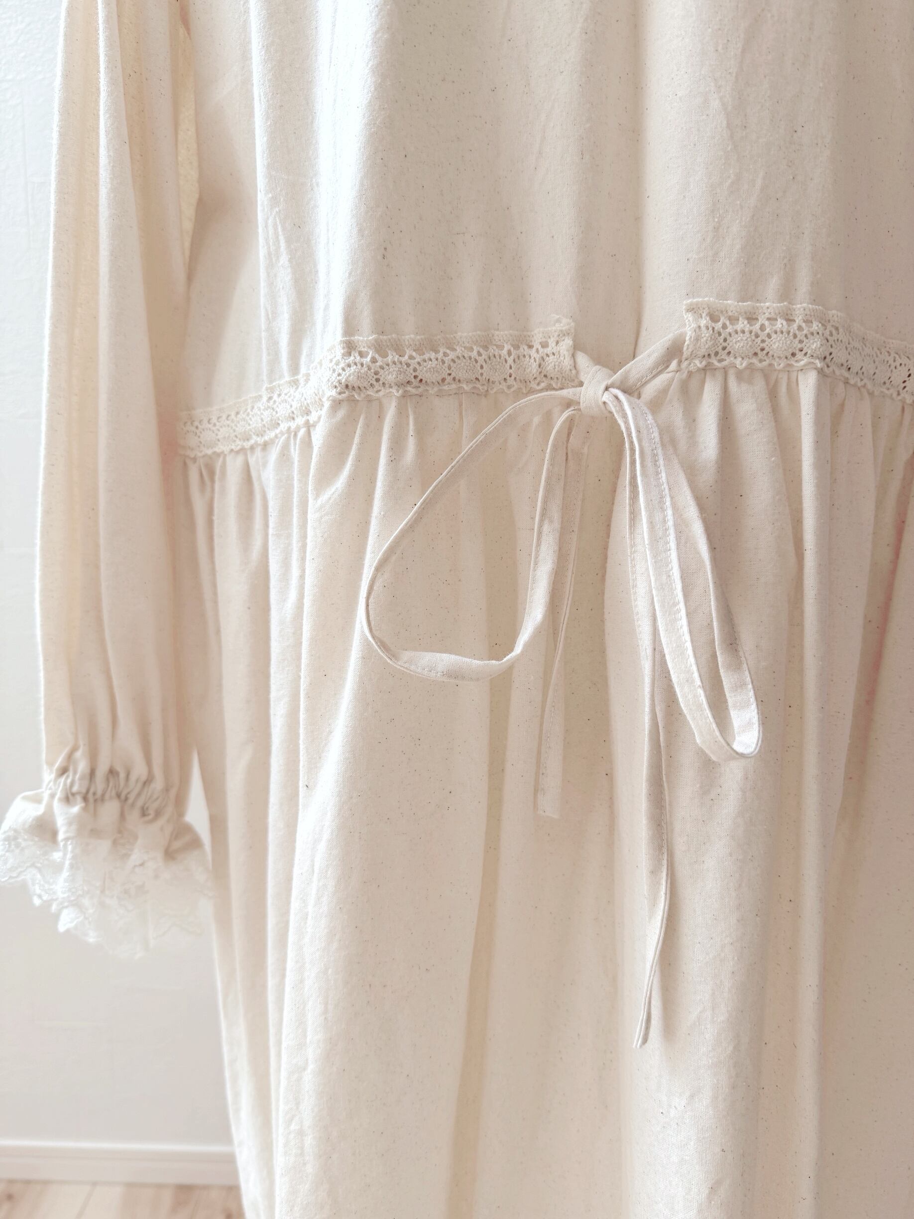 腰紐を通す部分もレーステープを使用し、細部にこだわりました。腰紐でウエスト絞ればより女性らしいシルエットを演出します。